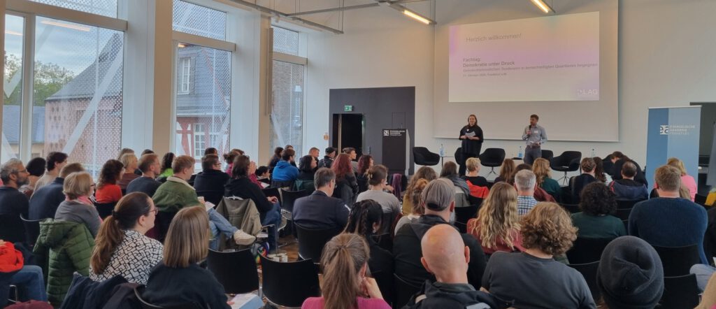 [/caption]Der Fachtag bot Fachkräften aus der sozialen Stadtteilarbeit, der offenen Kinder- und Jugendarbeit, der Gemeinwesenarbeit und dem Quartiersmanagement eine Plattform zum fachlichen Austausch, zur Diskussion und zur Vernetzung. Im Mittelpunkt stand die Frage, wie die soziale Arbeit vor Ort demokratiefeindlichen Entwicklungen wirksam entgegentreten und den gesellschaftlichen Zusammenhalt stärken kann.